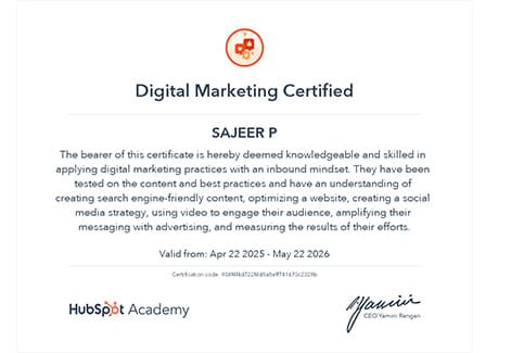 This certification reflects my understanding of core digital marketing areas including SEO, social media, content strategy, and email marketing—all built around the inbound methodology.
