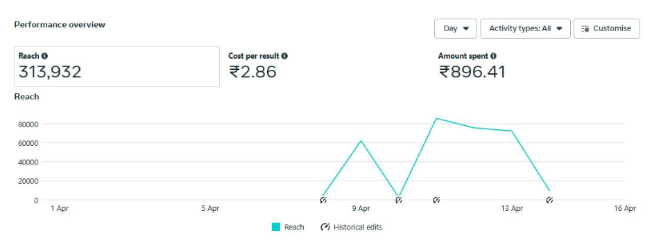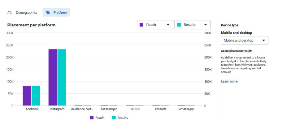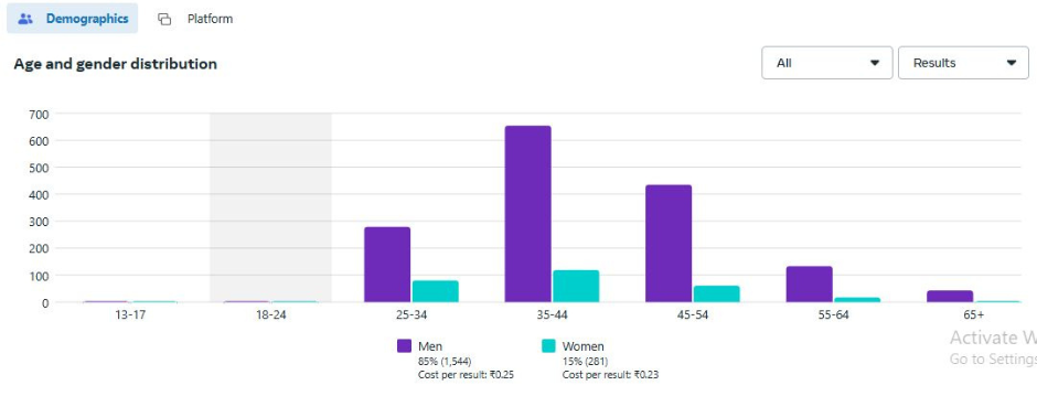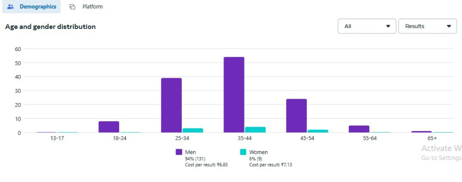 This Meta ad campaign was designed to maximize reach, successfully achieving a total reach of 313,932 at a cost of ₹2.86 per result, with a total spend of ₹896.41. The campaign primarily engaged the 18-24 age group, where 61% were men (at ₹2.84 per result) and 39% were women (at ₹2.85 per result), ensuring broad and effective audience exposure. Instagram led as the top platform, delivering a reach of approximately 250,000 and 150,000 results, while Facebook followed with a reach of around 100,000 and 50,000 results. Optimized for both mobile and desktop, this campaign underscores my ability to drive extensive reach and engagement through strategic platform selection and audience targeting.