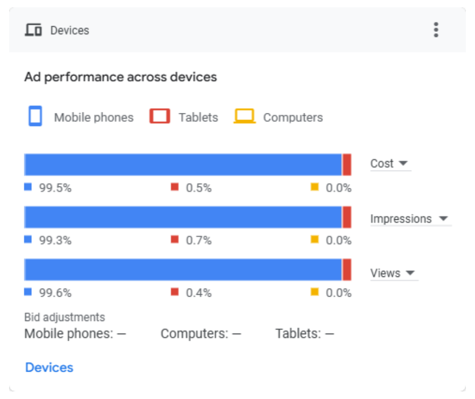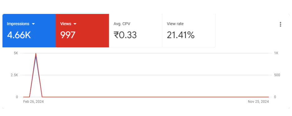 This Google ad campaign focused on driving video views, achieving 997 views from 4.66K impressions, with a cost per view of ₹0.33 and a view rate of 21.41%. The campaign saw a significant spike in views and impressions around late February, indicating a strong initial response. Performance analysis by day and time revealed higher engagement on Saturdays, particularly between 12 PM and 6 PM, highlighting optimal audience activity during these windows. Demographically, the campaign resonated most with the 25-34 and 35-44 age groups, with a balanced gender distribution. Device-wise, mobile phones dominated, accounting for 99.6% of views, 99.3% of impressions, and 99.5% of costs, with tablets contributing a minimal 0.4% of views, and computers showing no engagement. This campaign showcases my ability to optimize for mobile-driven engagement, target peak activity periods, and deliver cost-effective video view outcomes with a strong focus on the right demographic.
