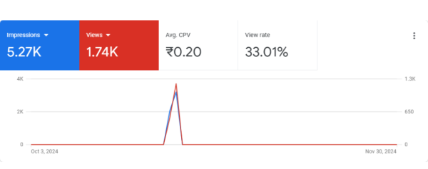 This Google ad campaign focused on driving video views, achieving 1.74K views from 5.27K impressions, with a cost per view of ₹0.20 and a view rate of 33.01%. The campaign saw a significant spike in views and impressions around early October, indicating a strong initial response. Performance analysis by day and time revealed higher engagement on Saturdays, particularly between 6 PM and 12 AM, suggesting optimal audience activity during these periods. Demographically, the campaign resonated most with the 25-34 and 35-44 age groups, with a balanced gender distribution. Device-wise, mobile phones dominated, accounting for 88.7% of views, 86.8% of impressions, and 88.4% of costs, followed by computers at 11.0% of views, while tablets had minimal impact at 0.3%. This campaign highlights my ability to optimize for mobile-driven engagement, target peak activity windows, and deliver cost-effective video view outcomes.